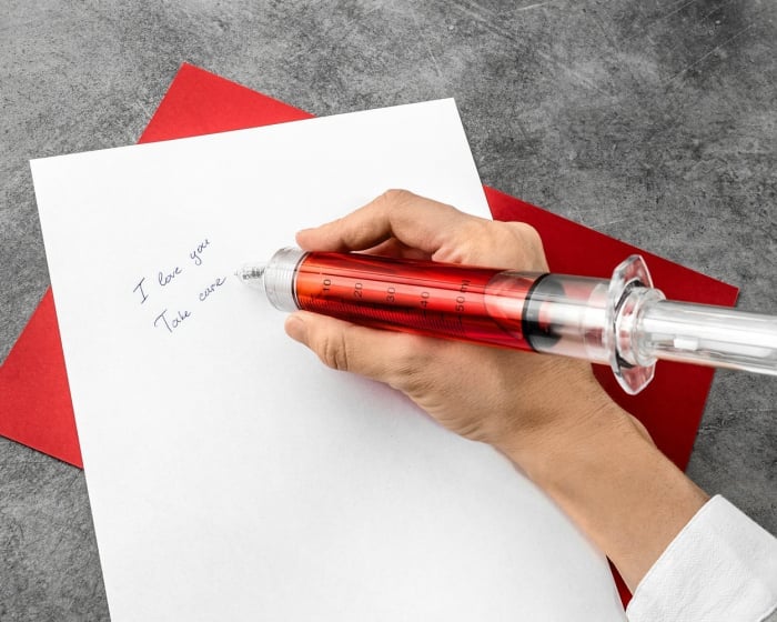 Pixul are lichid rosu care simuleaza sangele, dar scrie cu pasta albastra. Seringa gigant exclusivista masoara aprox.: 29 x 2.5 cm.