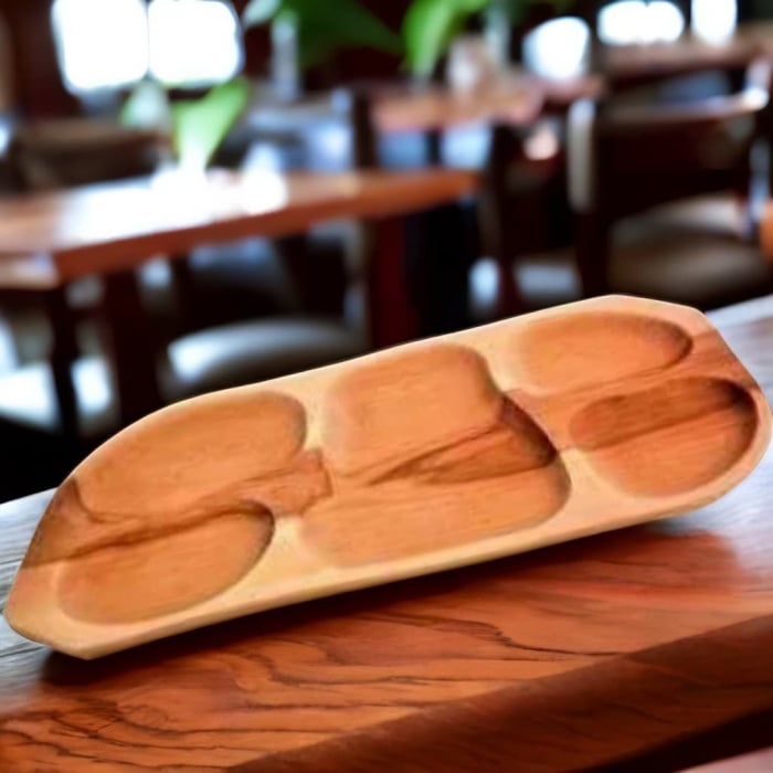 Platou din stejar cu 5 compartimente. Dimensiuni: 66 cm lungime x 30 cm latime x 2.5 cm grosimea lemnului. Avantajul acestui platou este compartimentarea , ce permite servirea mai multor preparate diferite.
